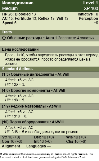 UPDATE: примерный стат-блок исследования 1-го уровня